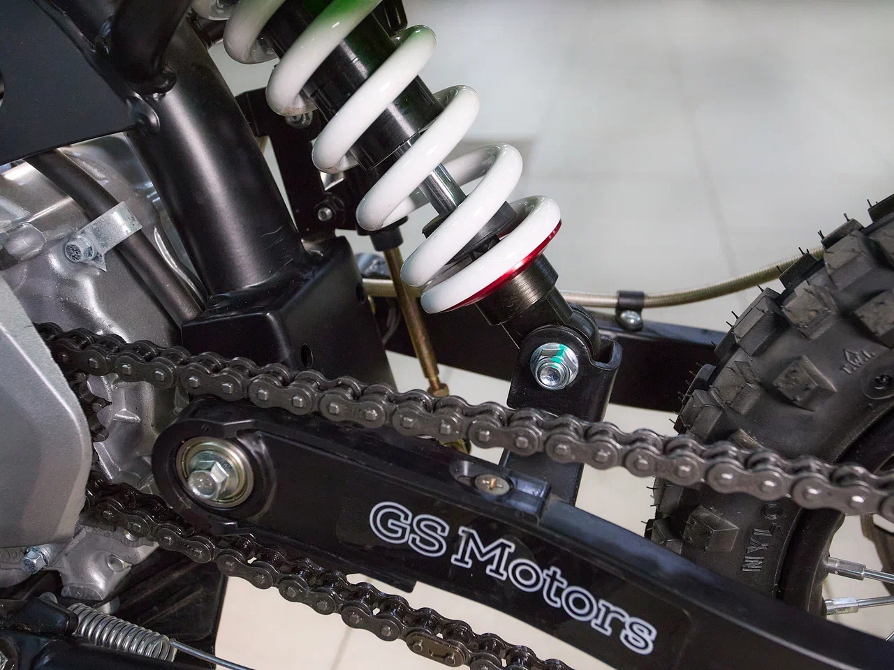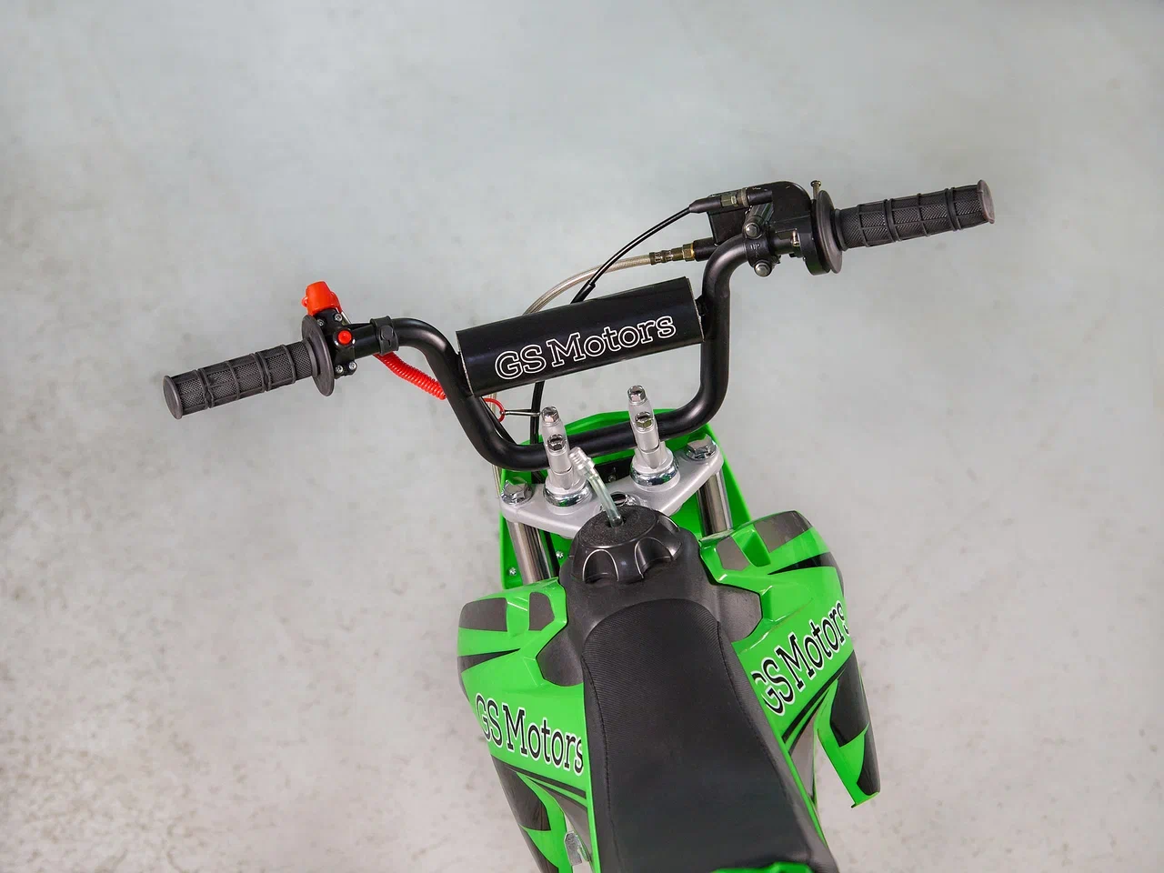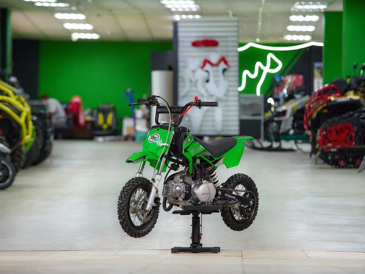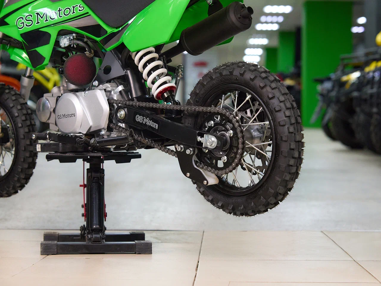 Недорогой надёжный питбайк GS Motors S7 идеален для поездок по грунтовым дорогам и бездорожью для детей которые уже научились ездить на маленьких мотоциклах объемом 50 куб.см. Хорошо чувствует себя на мягком и среднем грунте, разгоняется до 50 км/ч.