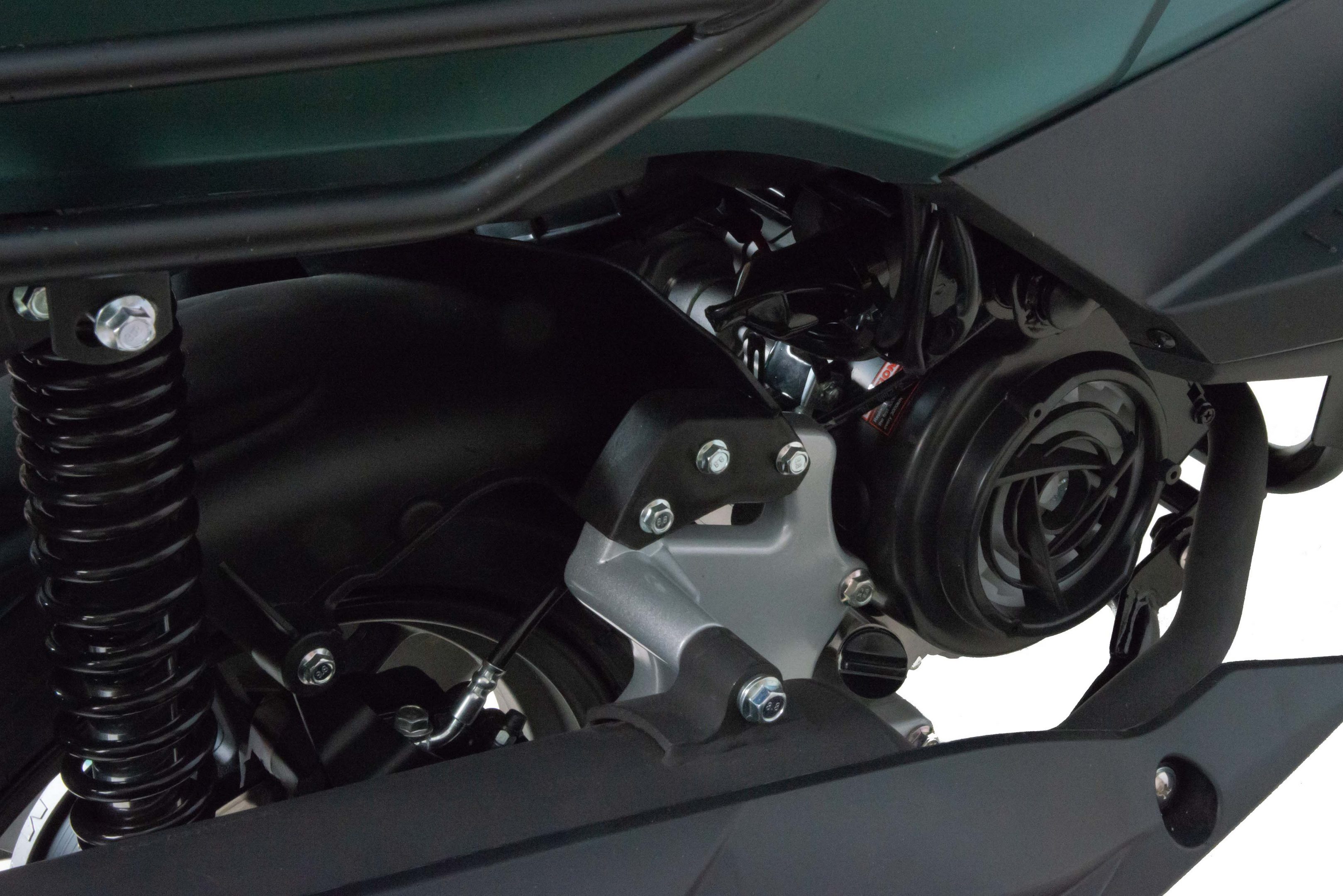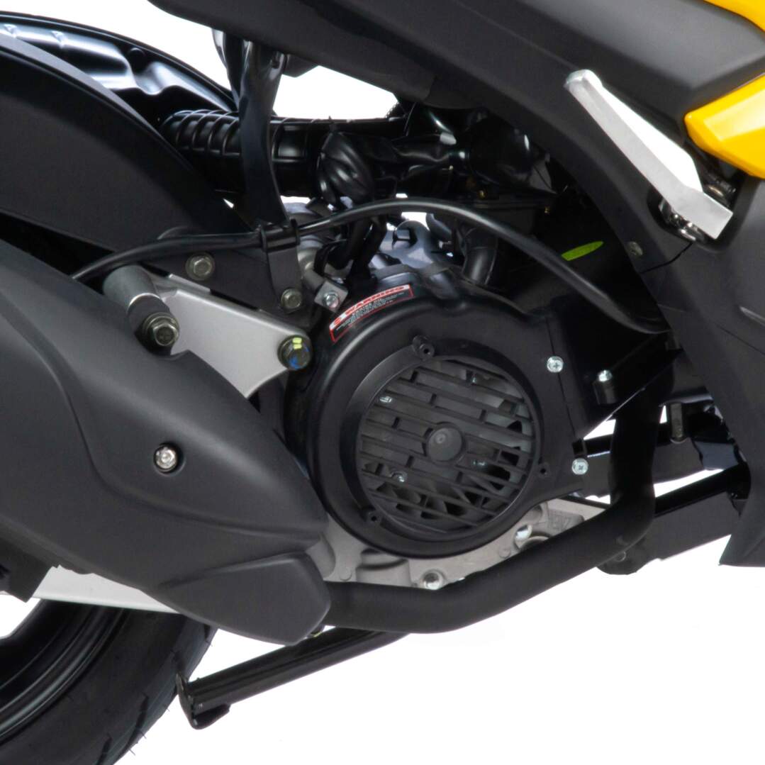 На скутере установлен одноцилиндровый четырехтактный двигатель 157 QMJ мощностью 10 л/с и рабочим объемом 150 см3 с принудительным охлаждением, что позволяет ему не перегреваться даже в сильную жару. Система запуска кикстартер + электростартер. Трансмиссия - вариатор, не требующий манипуляциях с переключением скоростей. Это очень удобно при эксплуатации и не вызывает сложностей, просто сел, повернул ручку газа и поехал. Все тормоза - дисковые гидравлические.