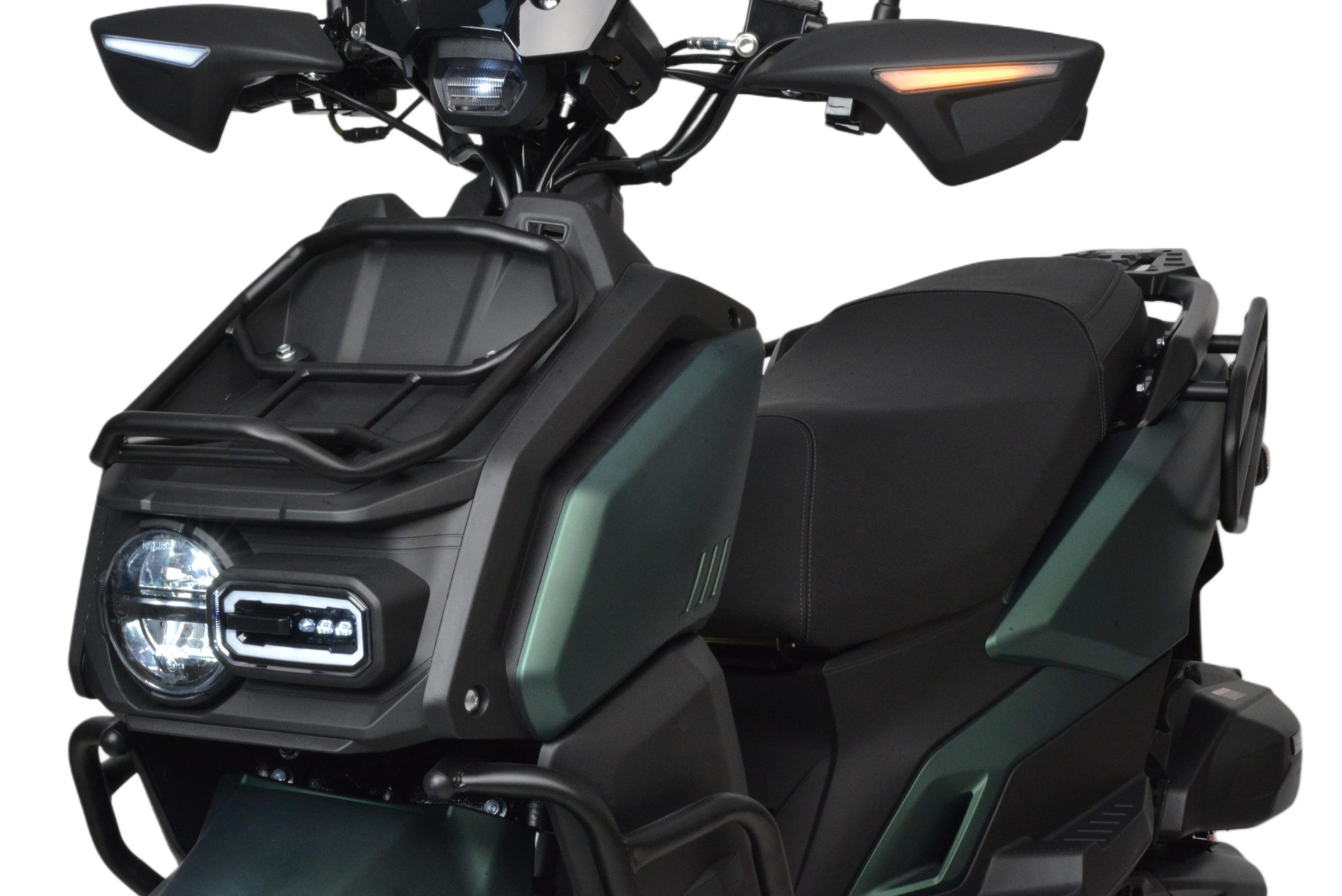 Брутальный внешний вид и черный цвет делает его не похожим на другие скутера. Дополнительные ДХО, светодиодные поворотники и стоп-сигнал.