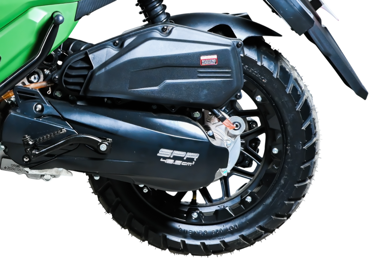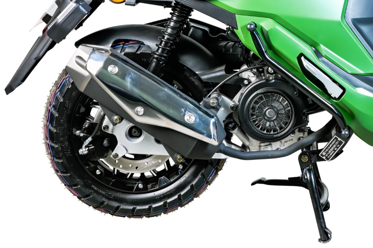 Скутер оснащён надёжным 4-тактным бензиновым двигателем, обеспечивающим стабильную тягу и плавный разгон. Автоматическая вариаторная трансмиссия делает управление простым и удобным, а воздушная система охлаждения гарантирует надёжную работу даже при интенсивной эксплуатации.