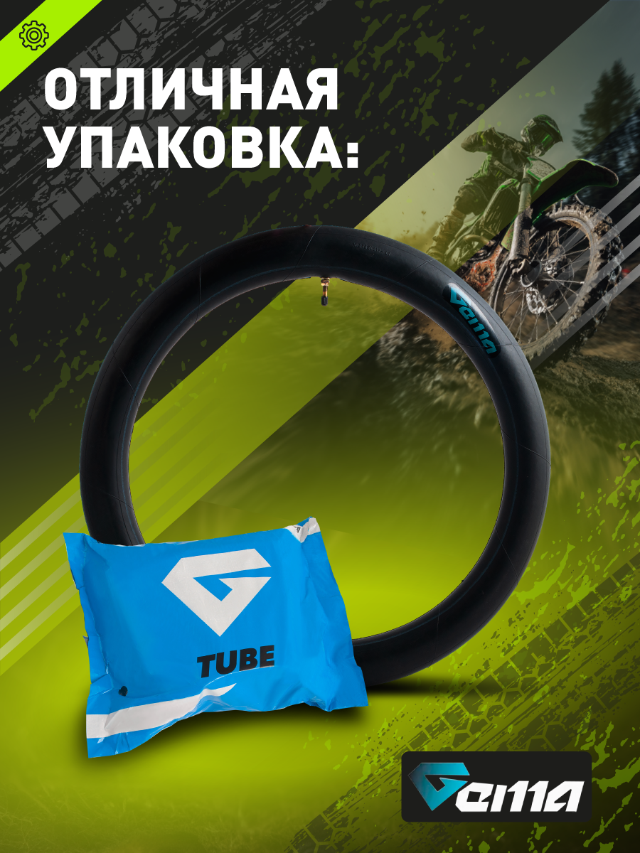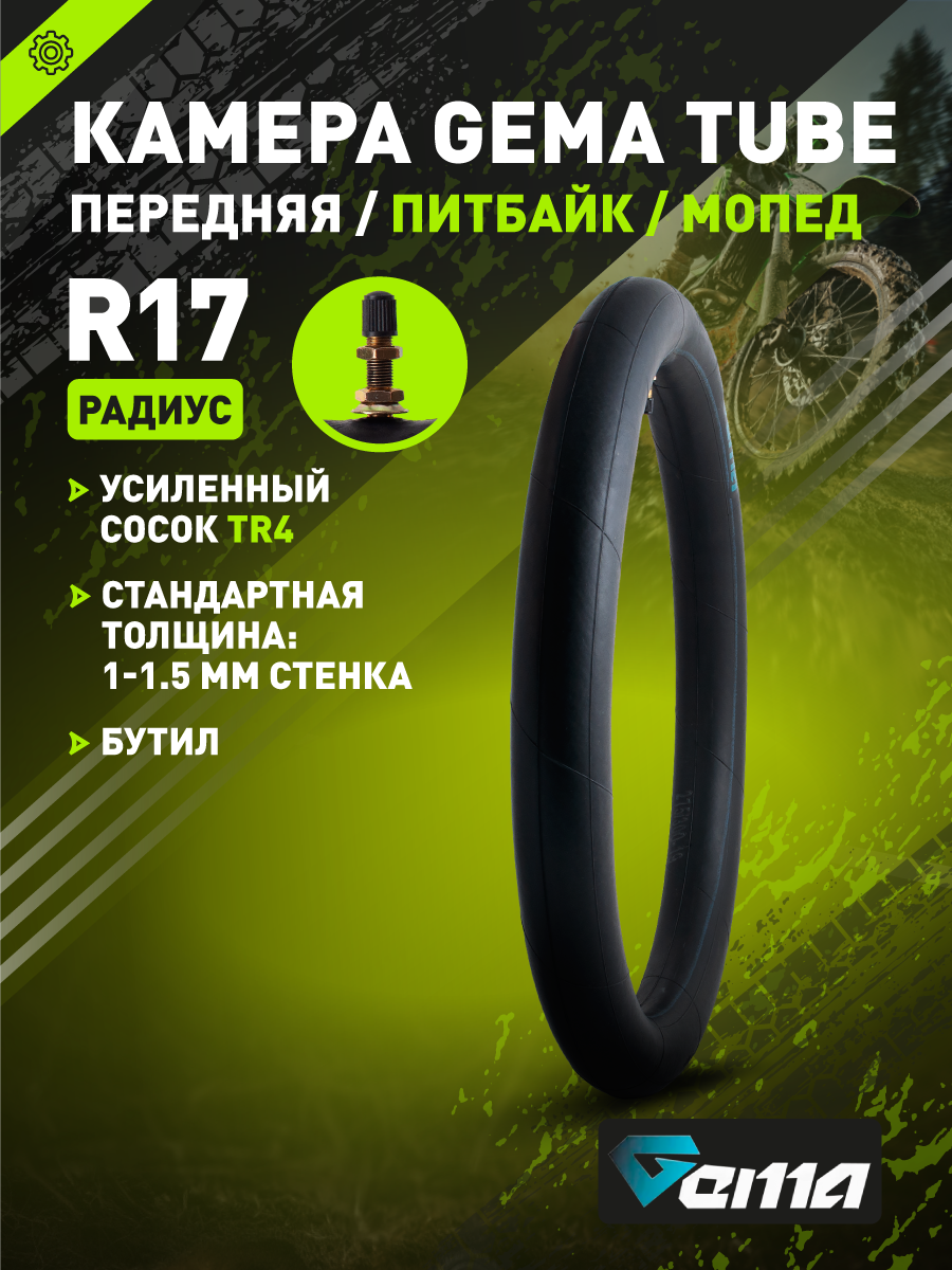 Универсальная передняя камера GEMA TUBE предназначена для питбайков и мототехники с передним колесом 17". Оптимально сбалансирована по весу и защите: усиленная бутиловая основа гарантирует устойчивость к проколам и длительный срок службы даже при регулярных поездках.