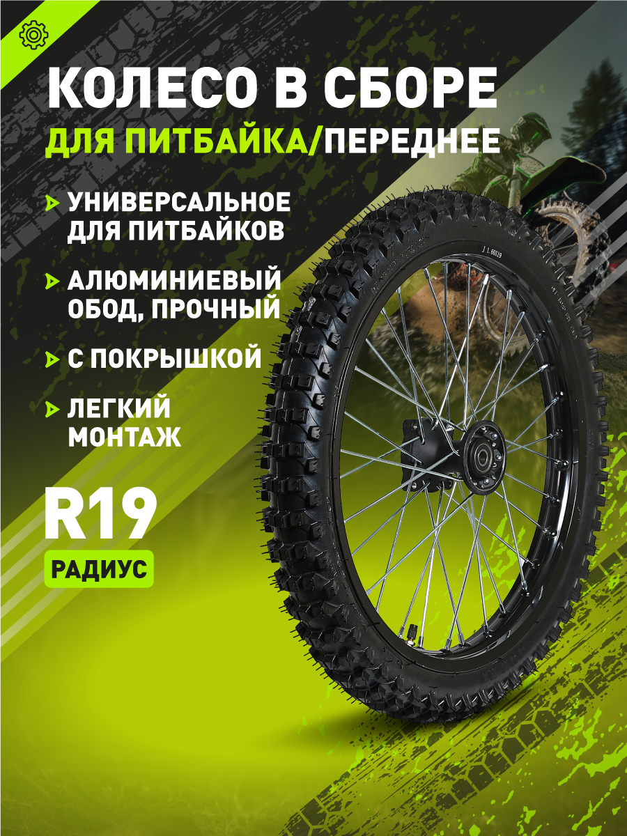 - Готовое к установке переднее колесо R19 с алюминиевым ободом и прочной втулкой под ось диаметром 15 мм. Комплектуется покрышкой Yuanxing 70/100 R19, что обеспечивает необходимый баланс между прочностью, лёгким весом и сцеплением на различных покрытиях.