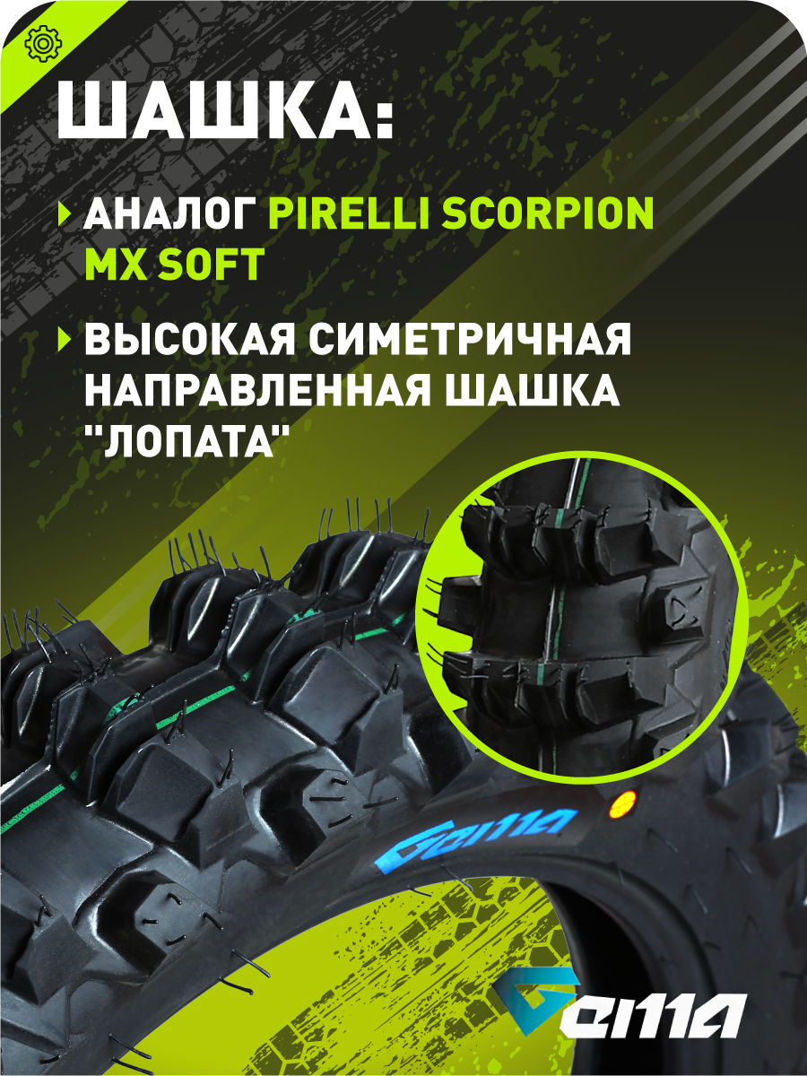 Гоночная кроссовая шина-«лопатка» для заднего колеса, разработанная для экстремального бездорожья (рыхлый песок, глина, грязевые трассы). Это 100% копия знаменитой Pirelli Scorpion MX Soft — повторяет форму, рисунок и структуру протектора оригинала, но имеет значительно более доступную цену без компромиссов по характеристикам.