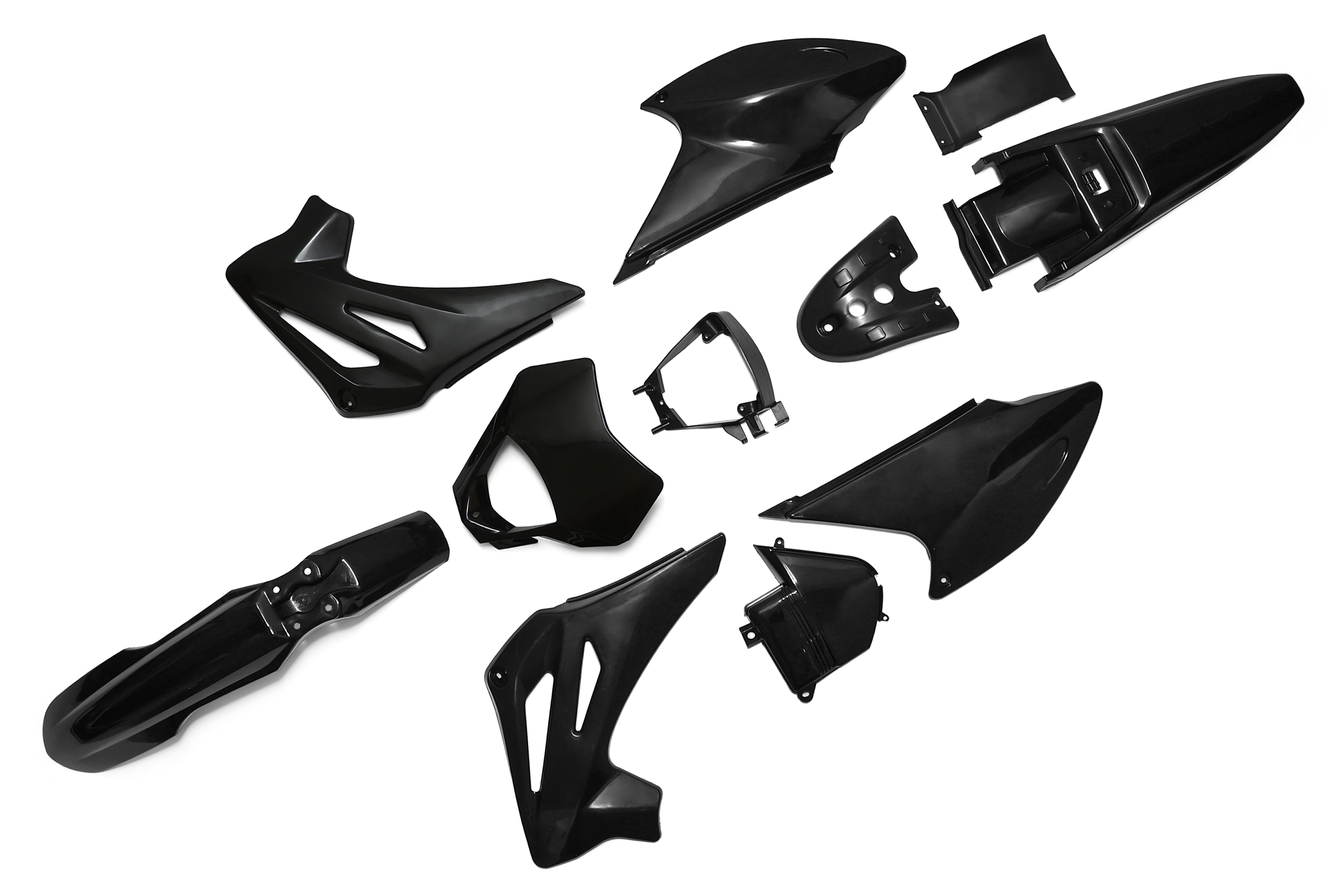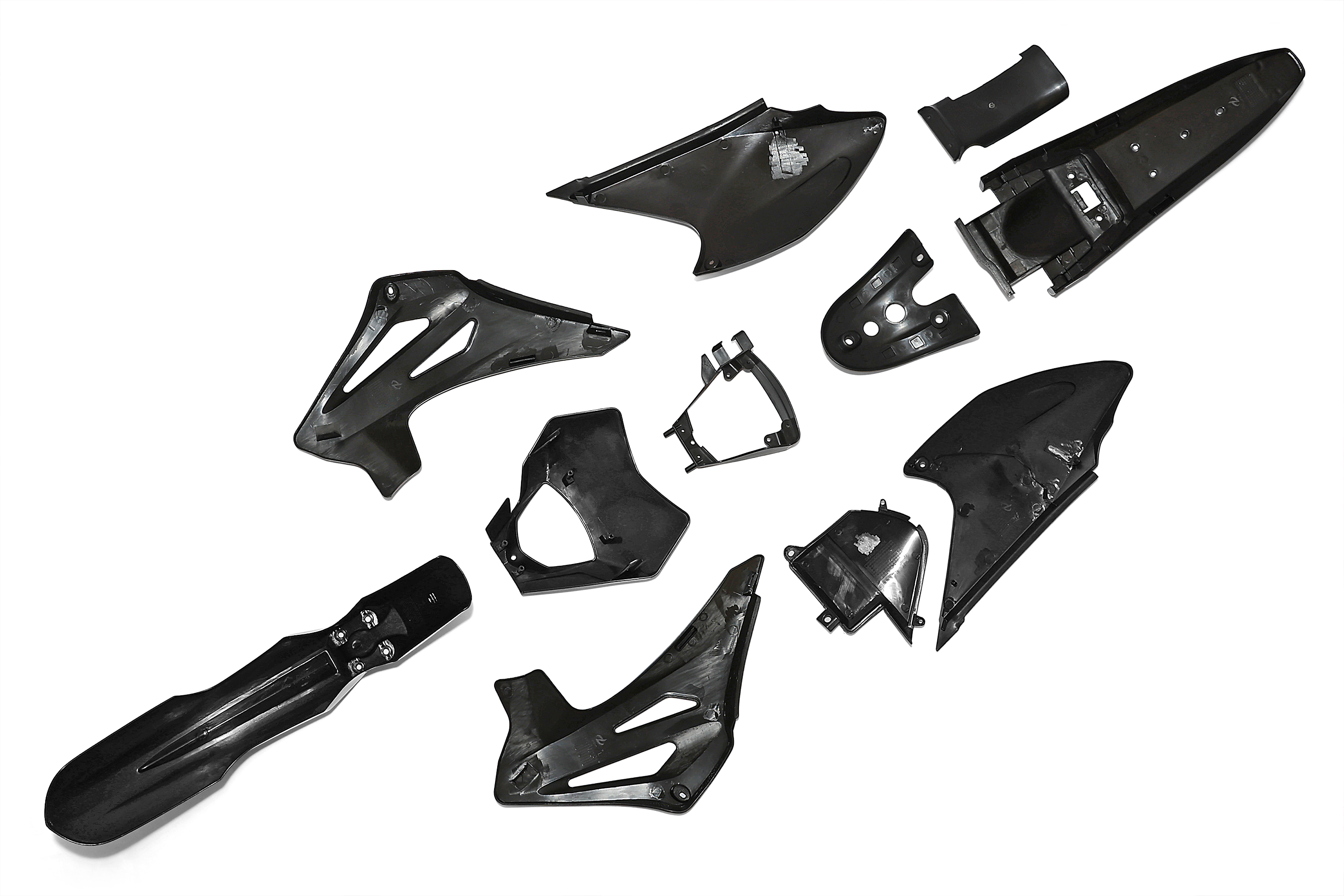 Полный комплект пластика чёрного цвета для мотоциклов эндуро и туристических моделей. Комплект изготовлен из прочного и эластичного пластика, устойчивого к ударам, вибрациям, УФ-лучам и экстремальным условиям эксплуатации. Все детали имеют точное соответствие оригинальным элементам по размеру и креплениям, что обеспечивает лёгкую установку без доработок и идеально подходит для реставрации, обновления внешнего вида или замены повреждённых элементов.