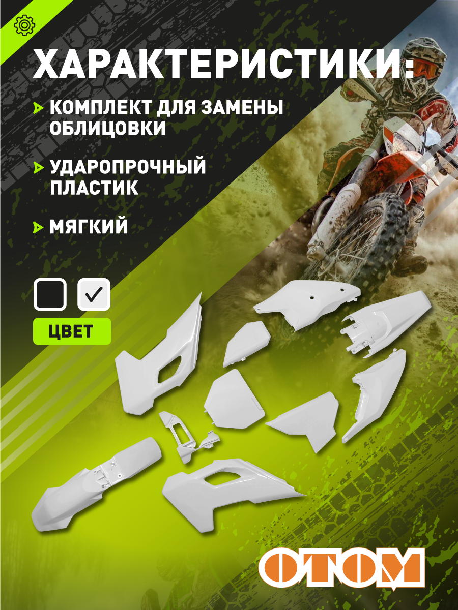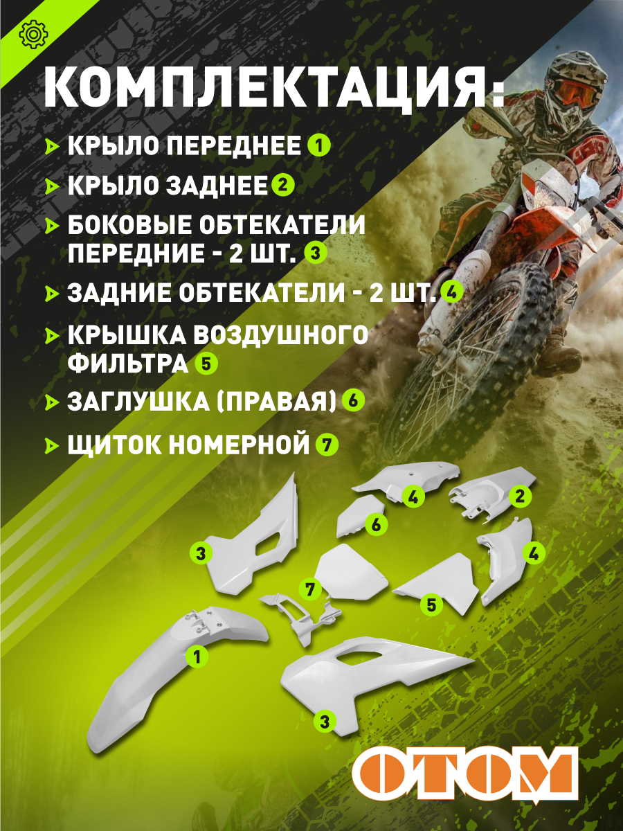 - Включает все основные элементы: переднее и заднее крыло, боковые обтекатели- на бак и задние, номер.