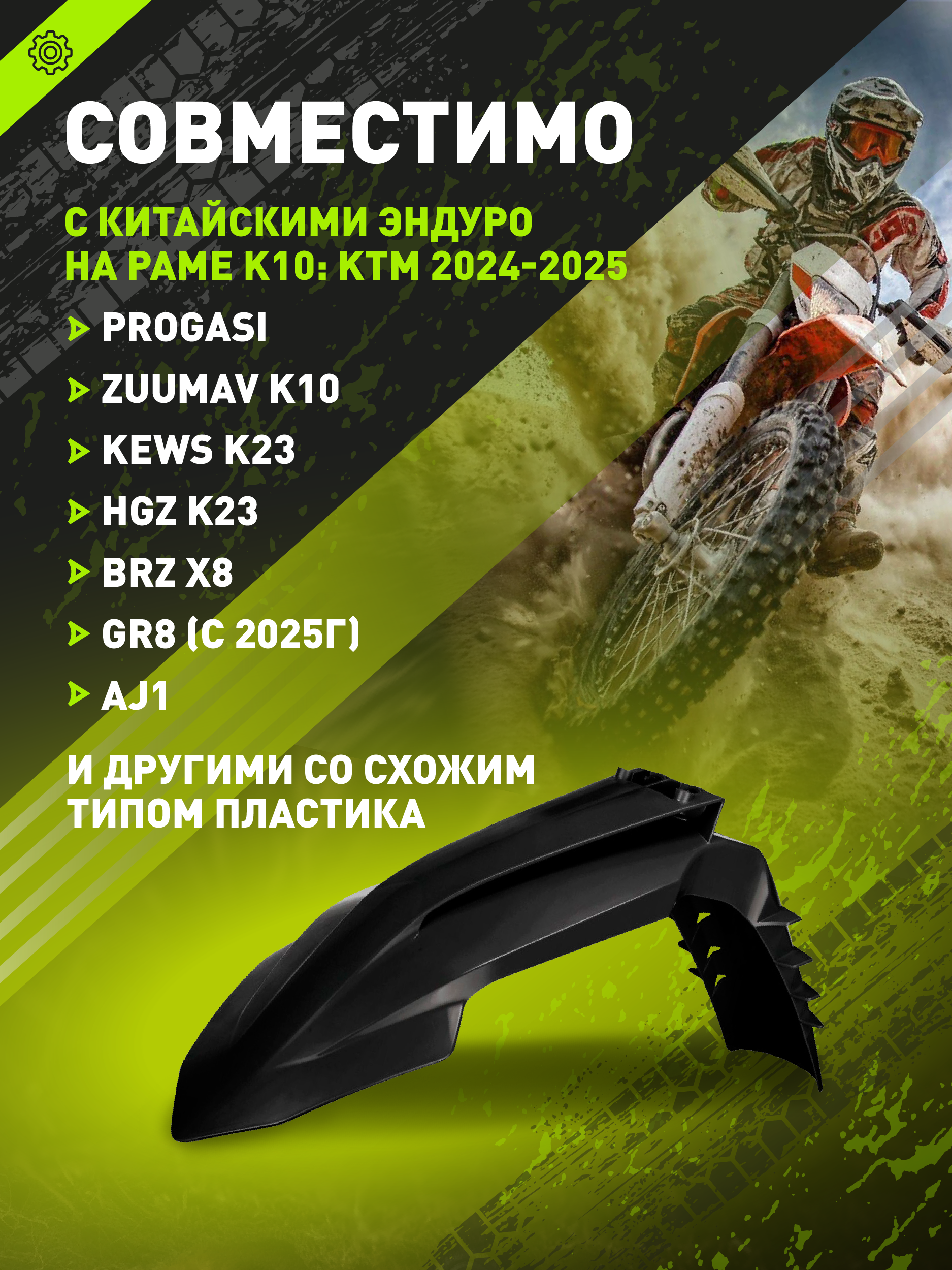 - Чёрное переднее крыло для мотоциклов на базе KTM 2024 года и аналогичных китайских моделей с рамой K10. Выполнено из прочного ударостойкого пластика типа KTM 24г. Эффективно защищает от грязи, воды и камней, подходит для установки на штатные крепления без доработок.
