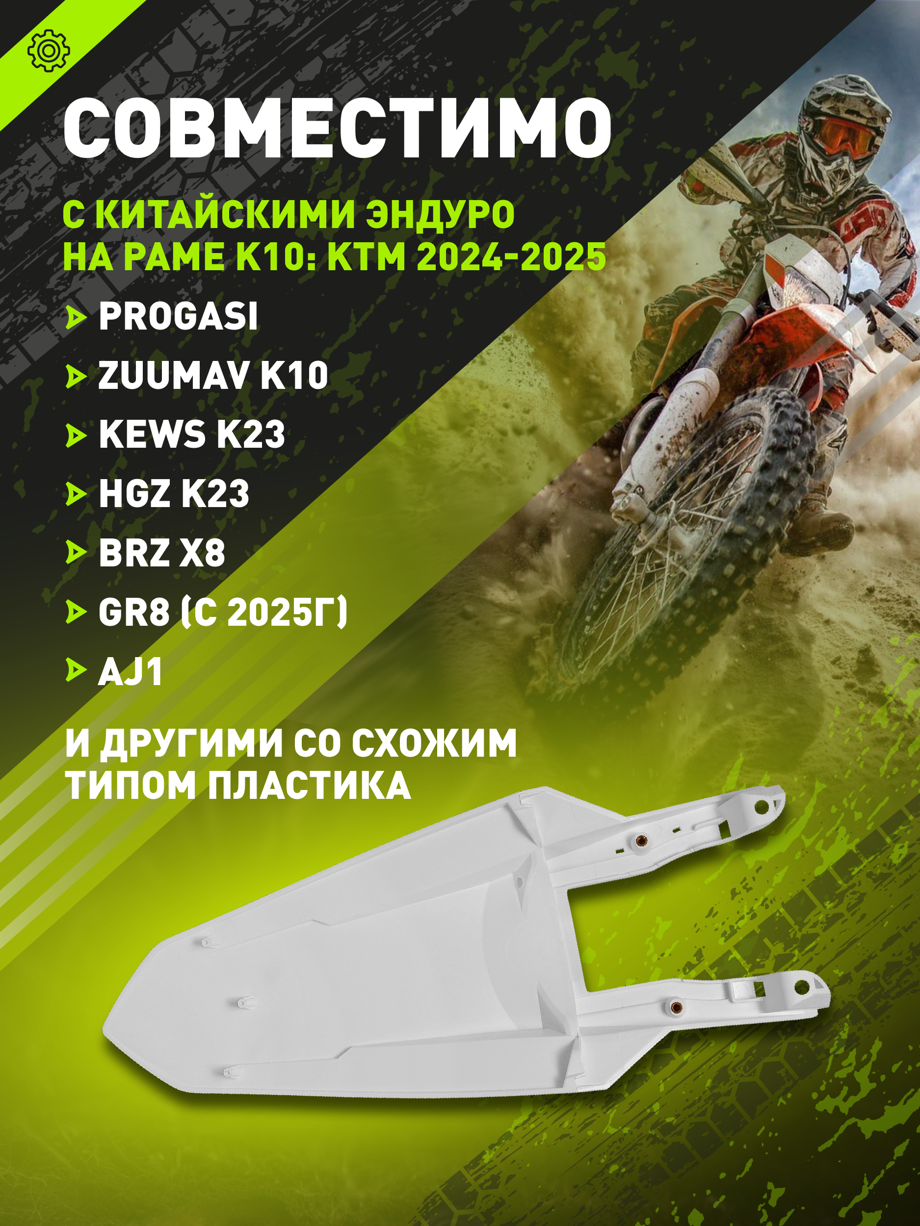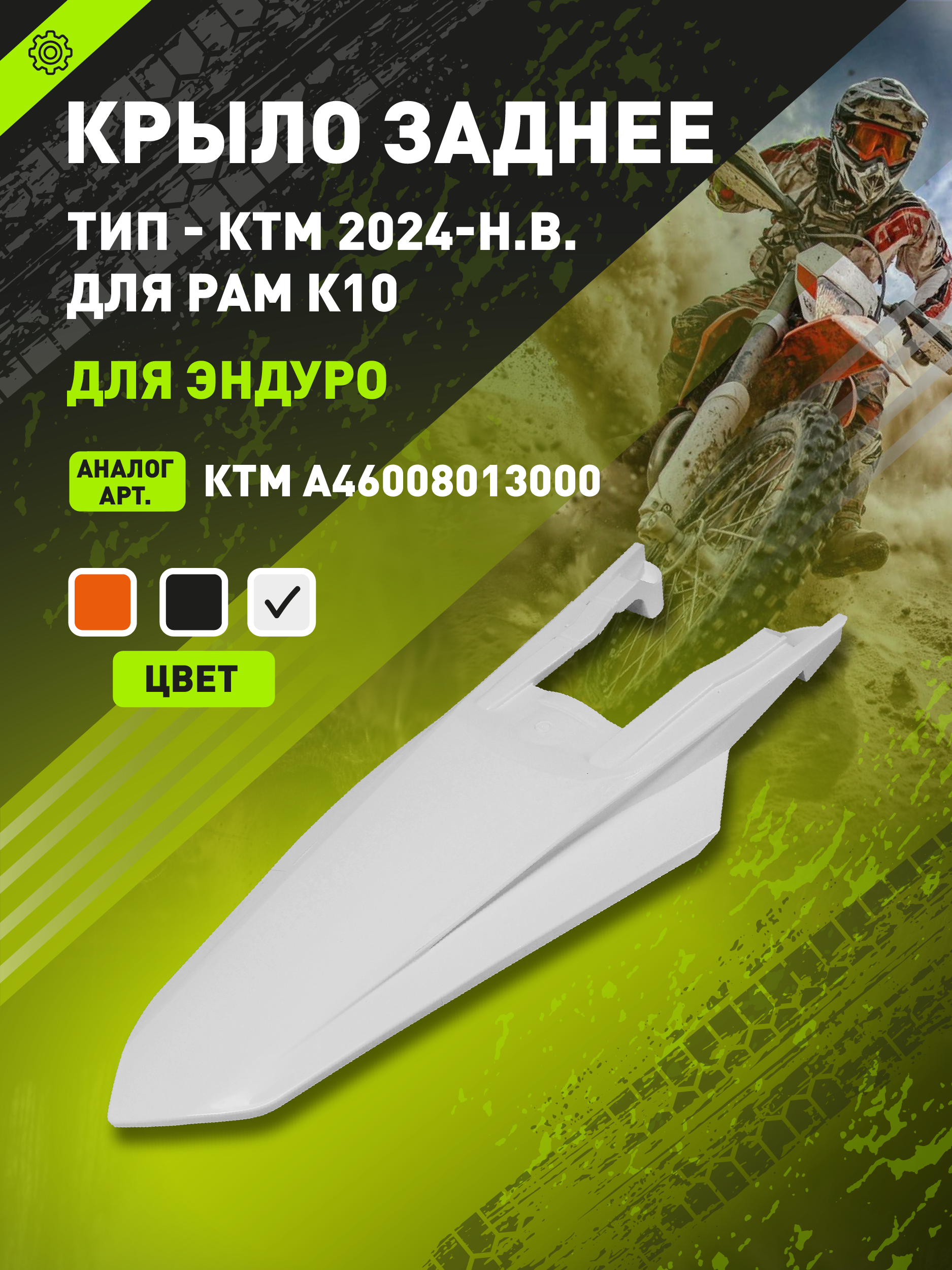 - Белое заднее крыло для эндуро мотоциклов KTM 2024 года, а также для аналогичных китайских моделей на раме K10 (KEWS, AJ1, BRZ и др). Изготовлено из прочного и эластичного пластика, соответствующего типу KTM 24г. Полный аналог оригинальной детали KTM с артикулом A46008013000EBC. Надежно защищает заднюю часть от грязи и повреждений, легко устанавливается на штатные крепления без доработок и придает байку свежий внешний вид.
