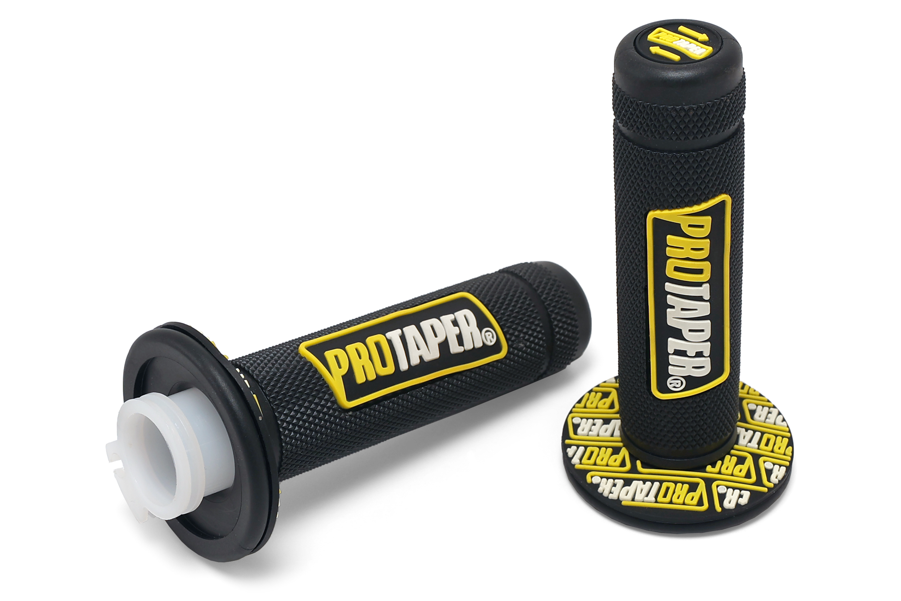- Комплект резиновых грипс Pro-Taper с пластиковой основой ручки газа для мопедов, питбайков, скутеров и эндуро мотоциклов. Левая грипса диаметром 22 мм устанавливается непосредственно на руль, правая грипса диаметром 22 мм интегрирована с пластиковой основой ручки газа стандартного размера.