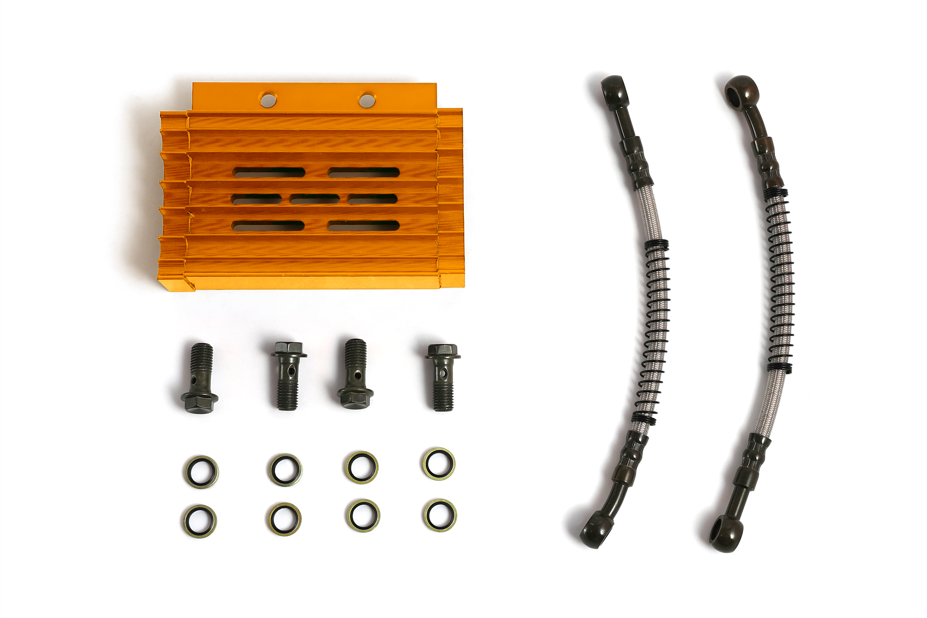 Высококачественный комплект радиатора масляного охлаждения с корпусом из прочного CNC-алюминия, ярко-золотого анодированного цвета. Разработан для установки на 90% питбайков и мопедов с объёмом двигателя от 125 до 190 см³. Обеспечивает эффективное охлаждение масла, защищая двигатель от перегрева и продлевая его срок службы.