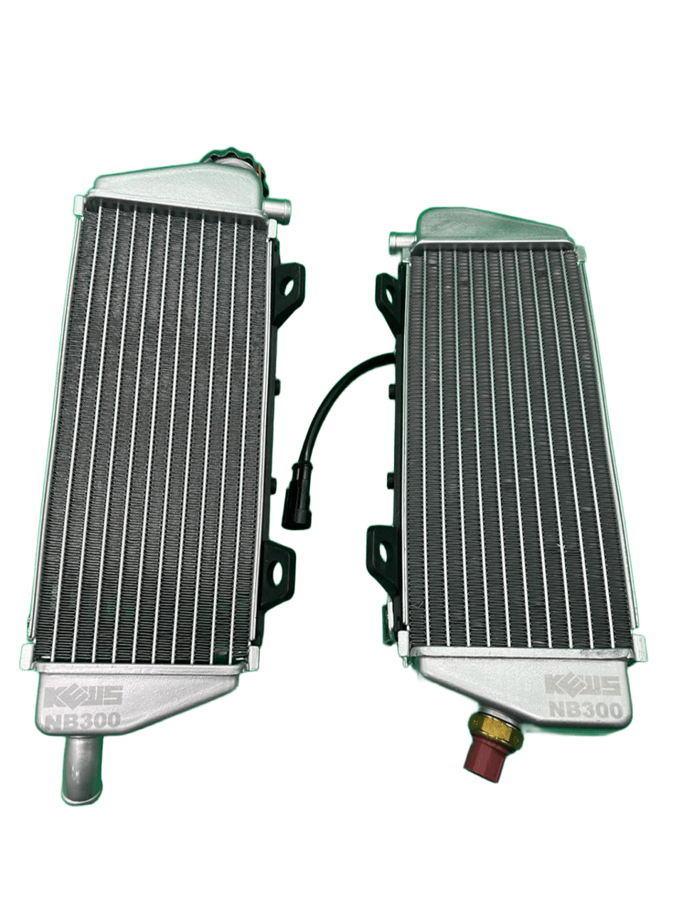 Комплект алюминиевых радиаторов для мотоциклов на раме типа K8 с двигателями 174-3A и 174-5A (NB300). Предназначены для эффективного охлаждения двигателя в условиях эндуро и кросса, обеспечивают стабильную работу системы охлаждения даже при высоких нагрузках.